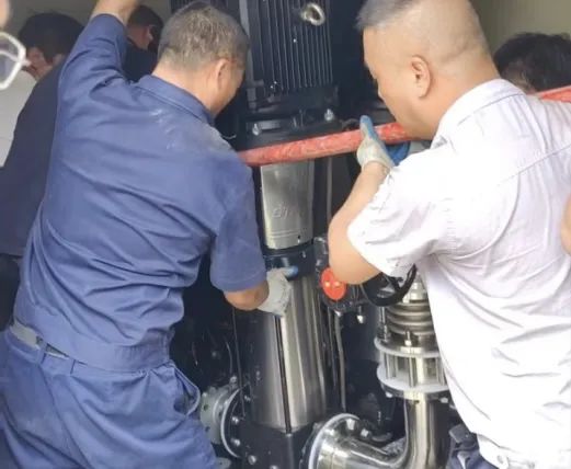 新水泵功率大,重量也非比尋常的設(shè)備,單臺泵重達(dá)1000斤,而泵房位置偏僻且面積狹小,無法進(jìn)行叉車、吊機(jī)等設(shè)備作業(yè),所有設(shè)備搬運(yùn)與安裝都只能靠單一的人力來完成。困難面前,運(yùn)維中心的工程師們迎難而上,他們利用鍍鋅管、鋼繩等簡單工具,肩挑手抬,吆喝著號子,硬是通過人力將所有水泵與配套零件全部安裝到位。