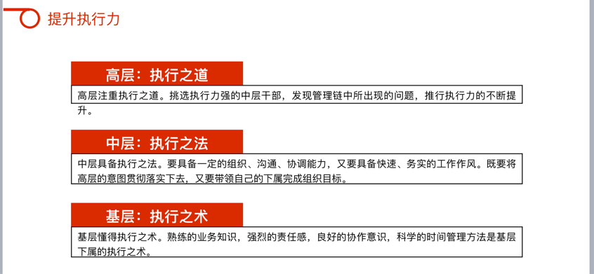 生動(dòng)形象地幫助大家建立了對(duì)執(zhí)行力的結(jié)構(gòu)化認(rèn)知,更進(jìn)一步理解到了工作態(tài)度、工作職責(zé)、工作任務(wù)、工作結(jié)果的邏輯聯(lián)系,以及如何在強(qiáng)化執(zhí)行力的同時(shí),提高部門運(yùn)作效率,使效能與效率相輔相成,創(chuàng)造出更高的部門績效。